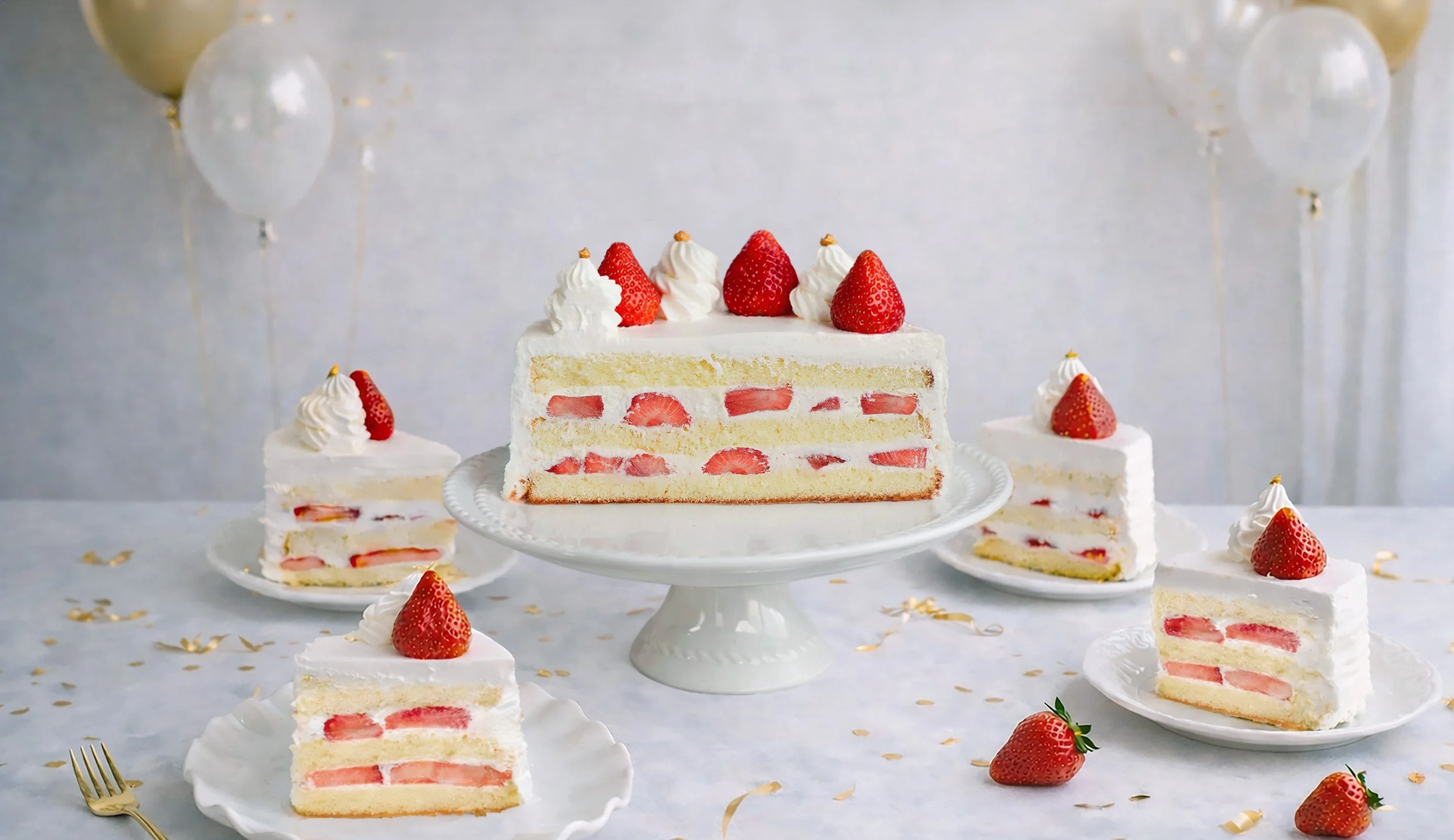 Classic strawberry fresh cream cake with airy sponge, whipped cream and juicy strawberries.